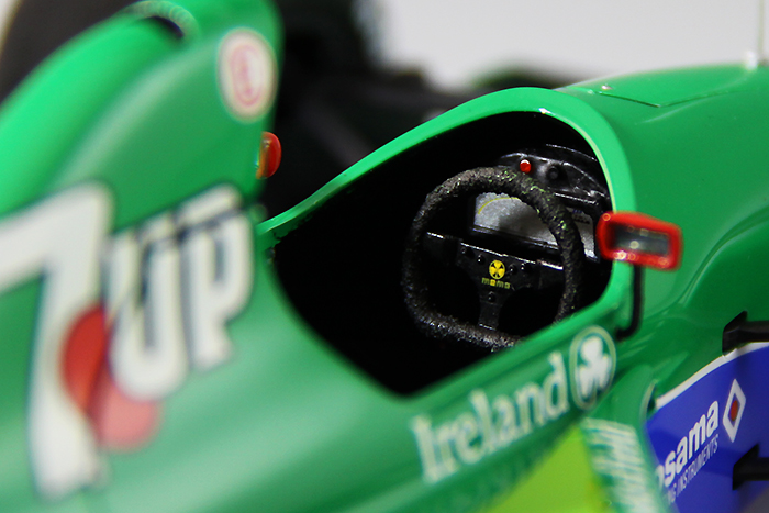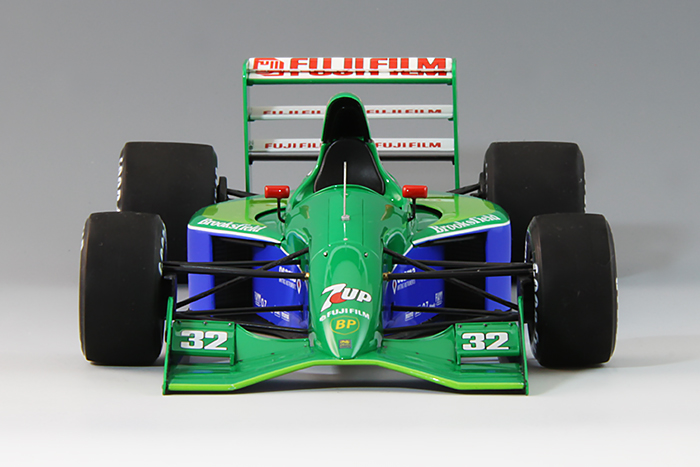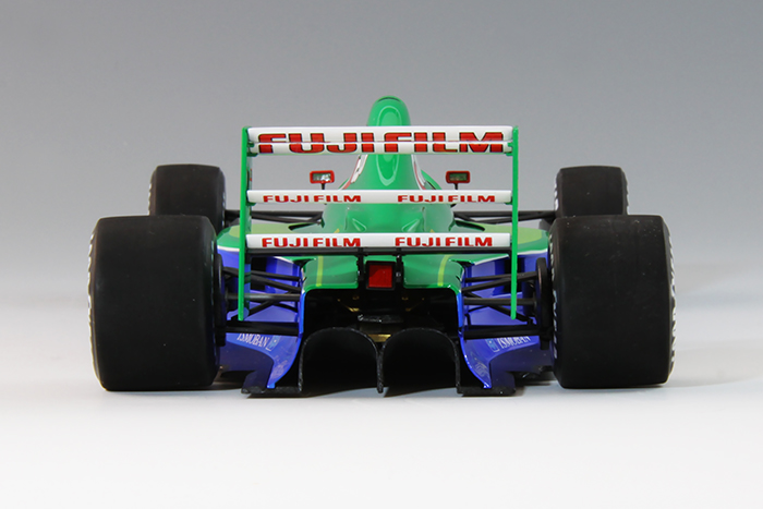 古いキットのためカウルがねじれてうまく合わず、軽く熱を当てて調整したがこれがが限界。フロント・リアウイングの翼端板を薄く削り、バックミラーのステーを真鍮線に変更、アンテナの追加以外はストレート組み。カウルの合わせ以外は問題なく組めた。SHUNKOのデカールを使ったが"tictac"などが無いと間が抜けた感じがする。リアウイング最上部の"FUJIFILME"のロゴはそのまま貼ると間延びしてしまうので下半分の天地をカットして貼った。カーボンデカールはタミヤの「平織り・細目」「綾織り・細目」、エッフェ・アルテフィーチェの「綾織り M」を貼って、セミグロスクリアーでコートした。ノーズ先端からフロントウイングにかけてはまだ接着しておらず思案中。