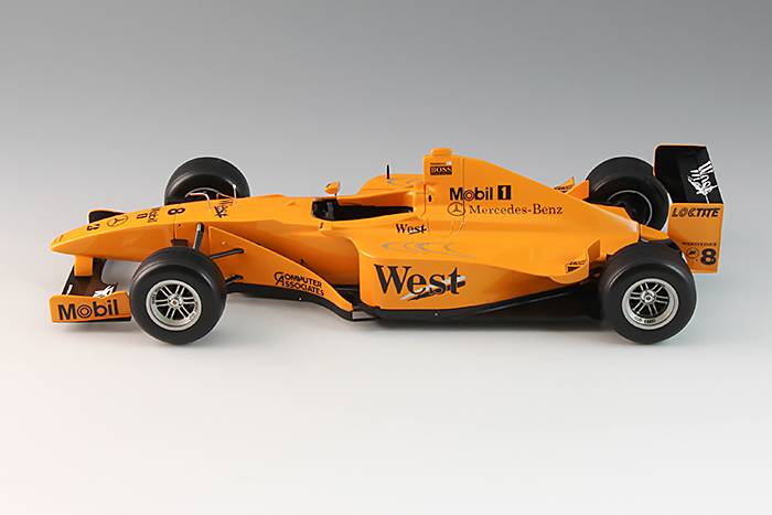 通常バージョンを作る前に一度キットを作っておこう思い、デカールも持っていたので製作開始。古いキットので歪みなどが無いかをチェック。若干カウルが開き気味だったので温めて調整。モノコックからノーズにかけてのパーツが左右分割されているため、接着するとシートなどを入れれなくなる。入る大きさに裏側を開口。テストバージョンにはインダクションポッドの下にあるフィンとカットしカメラの取付部分を埋めた。インダクションポット上部のカメラ基部は一部カットせいて整形。エキゾーストパイプの後端がメッシュ状になっていたので医療用のメッシュテープを貼ってみたが塗装すると微妙だった。ボディ職がなかなか決まらなく苦労した。ピュアオレンジにニュートラルグレーIIで明るさを調整後にミディアムイエローで赤味を調整。塗装が乾くとまだ赤味があったのでピュアイエローで調整。タブデザインのデカールを使用したが「CAMOZZI」と「SUN」がサイズオーバーだった。「CAMOZZI」そのまま使用したが「SUN」は貼れる場所が明らかに変わってしまうので解像度が低いが付属のデカールを使用した。ホイール用の「ENKEI」はホワイトだったが、シルバーで仕上げたので付属ものを使用。アンダートレイの耐熱シートはいつも台所用のアルミテープを使うが今回エンボスが欲しかったのでたばこの銀紙を使用。裏面のスキッドプレートはハンズで買った木を薄く削って作った折り紙を使用。本物の木なのでいい感じになった(見えないが・・)。モノコックまわりの問題があるが、比較的作りやすきっとだと思う。