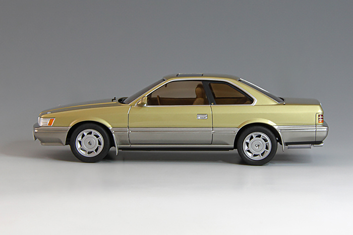あぶない刑事の車で有名過ぎる車。そのイメージが強すぎて前期はゴールド、後期は紺色で製作することにした。ゴールドは赤側い振れたくなかったのでブルーゴールドをベースにして調整した。内装のモケットは、100均で買った貼れる布テープを使用した。車高は低い方を選択。