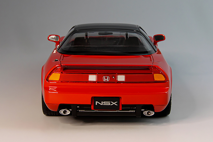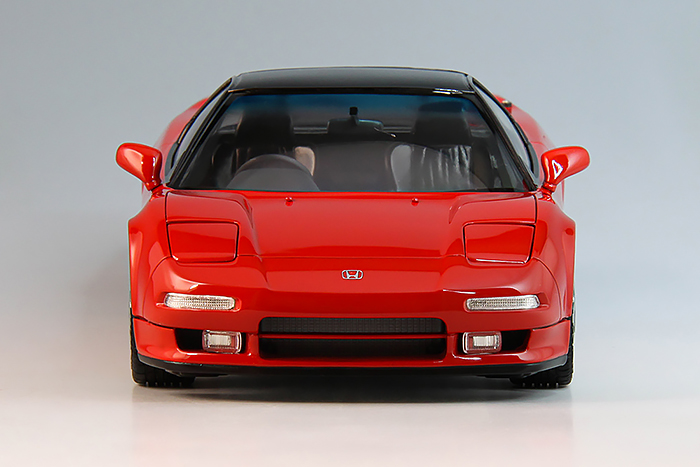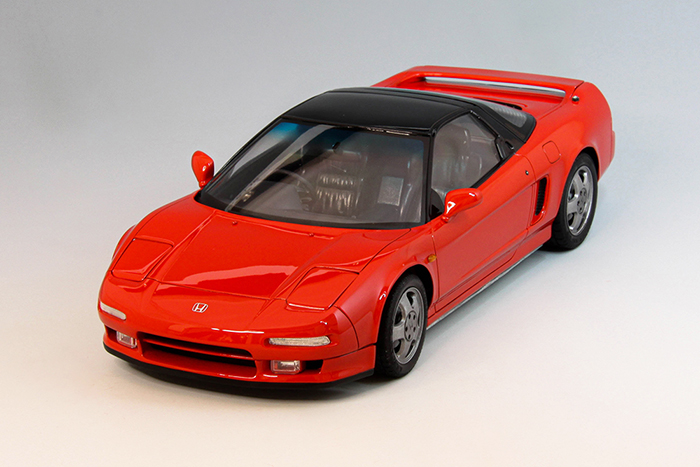 新旧のNSXが欲しくなって製作。特に問題も無く組めたのだが・・。仮組の時は綺麗に収まっていたシャシーが塗装が終わって組み込むとうまく収まらない。どこが緩衝しているのか見つける事ができかった。フロントウィンドウはデカールを使わず、クリアブルーを斜に吹いて軽くグラデを付けた。ホンダのマークは2代目NSXのインレタを流用してメリハリをつけた。
