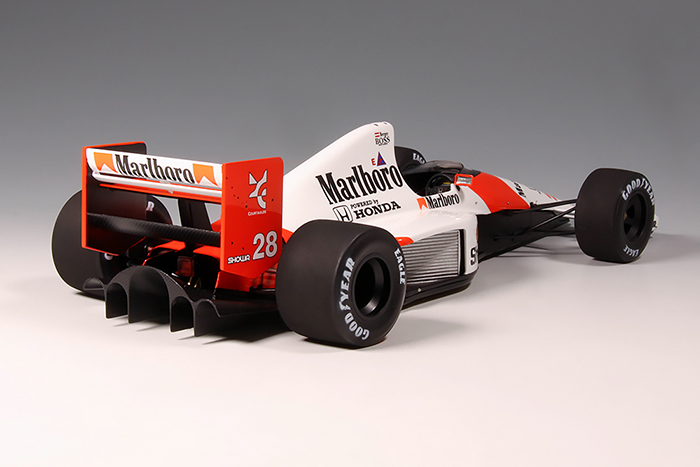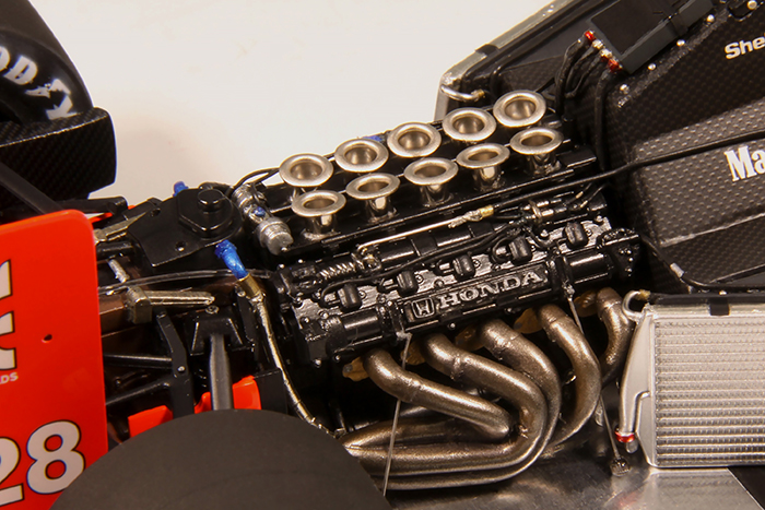 約30年からお手付きになっていたキットを製作。シンナー風呂から再開で30年間の垢を洗い落した。組みやすいキットなのだが1カ所大きな問題があった。ノーズ部分がシャシーとカウルの角度が違うため合わせると浮いてしまう。角度を調整せずカウル全体をインセクトピンで固定して浮かないようにした。パイピングやエアファンネルにハトメを使って製作。塗装は微量の青を加えたピュアホワイトの後、バルケッタのフォーミュラー蛍光レッドを使った。蛍光塗料特有の染み上がりもなく非常に使いやすい。