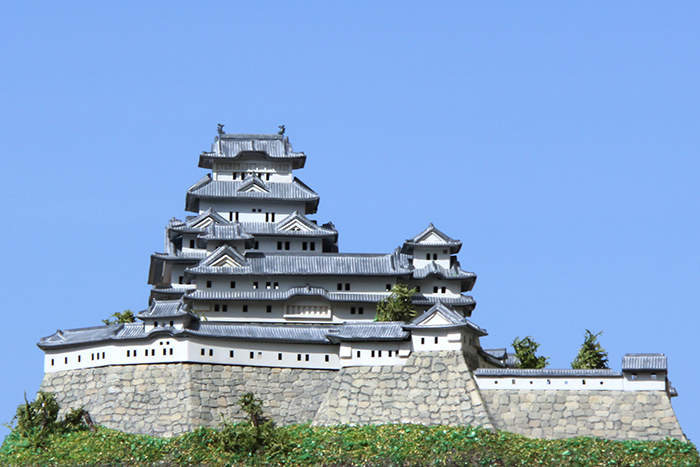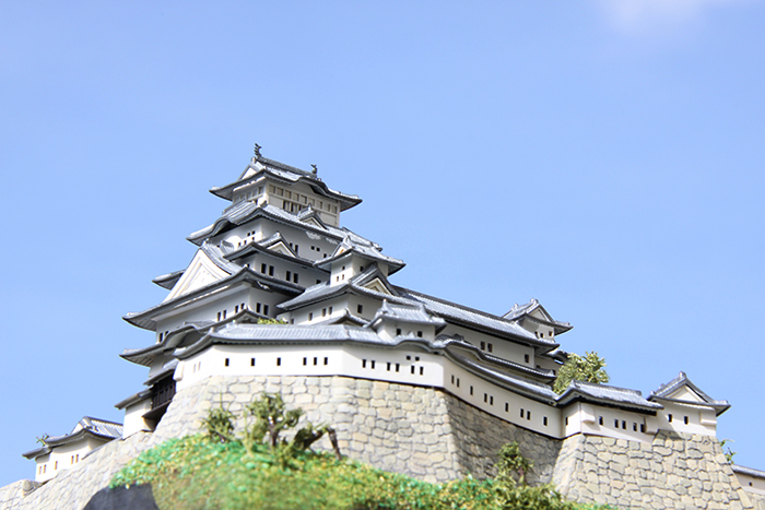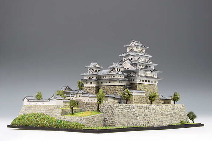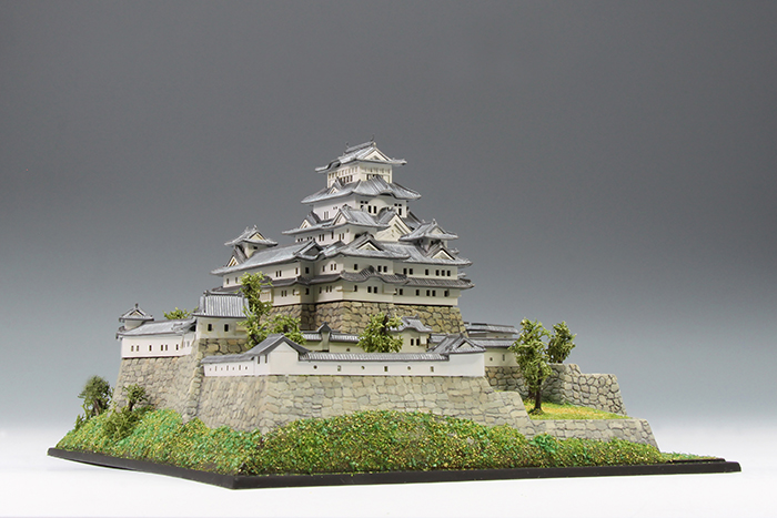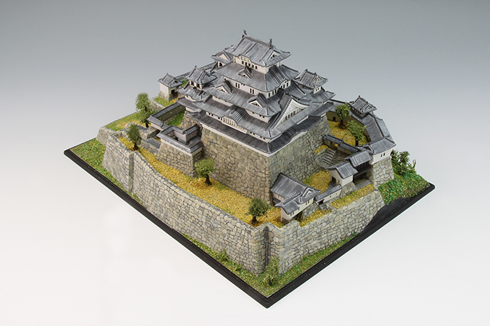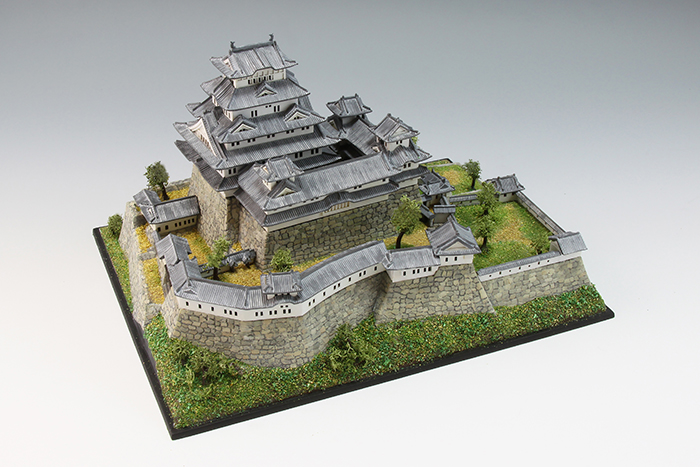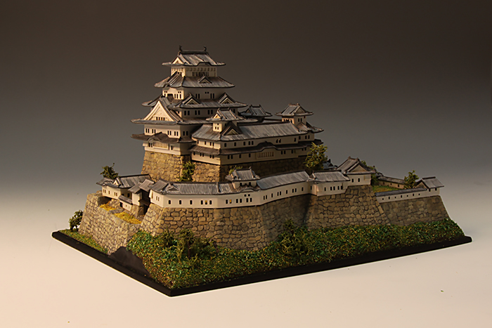 何年も前に子供と一緒に作っていて、途中で放置されていたのを引っ張り出してきて一人で再開。当初、ベースが私で上物が子供の役割分担で進めていたので子供が作ったところは極力そのままにする方向で進めた。石垣の掘りが浅いので、根気強くリューターで掘り直した。石を一つづつ塗り分けてエナメルのブラックでウォッシングした。子供がズレたまま接着したところは、全体に歪んでしまうため切り離して接着しなおした。初めて情景パウダーを使ったが、やはりまだまだだった。窓から向こう側が見えないよう建物の中に目隠しを入れた以外は難しいことをせずに組んだ。