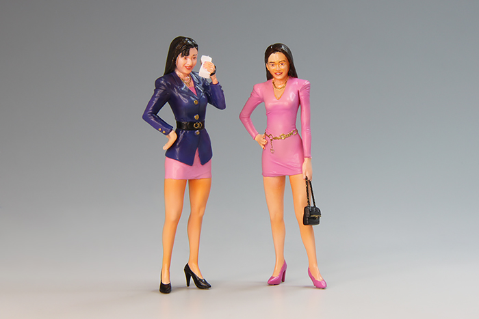 怖くて手が出せなかったフィギュアに初めて挑戦してみた。作ってみると、とても楽しい。特に女性フィギュアは楽しい。ピンクの女性のヒールを無くしてしまい、プラ材から削り出しで再生した。スカートの中が抜けて無いためぼってりと見えてしまい残念な感じだったので、スカートの中を削った。見えそうで見えなくてといういい感じになった。女性フィギュアの塗り方を調べてみると、皮膚から透けて見える赤色を弾いたような点を塗ってから肌の色を塗るようだったので、一人をそうしてみた。が、あまり差が出なかった。光の当たり方に気を付けて塗ったがまだまだだなと・・身長が綿棒の長さくらいしかなく、超極細の筆と拡大鏡がないと顔を塗るのは難しい。最後に半艶のクリアーでコートしたが思ったよりも艶がでてしまった。この後、艶消しを塗って終わりにした。